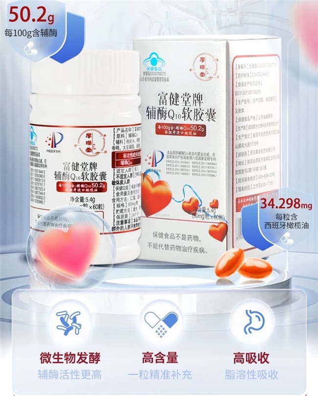 每100克里实际含有54克辅酶Q10,比标注的50.2克还多!拥有8项国家专利,专门针对咱们亚洲人的体质优化配方。吃进去特别好吸收,吸收率高达95%,效果也很靠谱,有效率能达到98%。还加了34.298毫克从西班牙进口的橄榄油,帮助身体更好地吸收营养。用的是金达威的优质原料,做成小小的胶囊,吞服特别方便。它的“心脑双重呵护”配方,还通过了权威认证,用过的人98%都给好评。很多人坚持吃30天,就能明显感觉到变化,特别是保护心脏、缓解心衰引起的各种不舒服,效果特别突出。